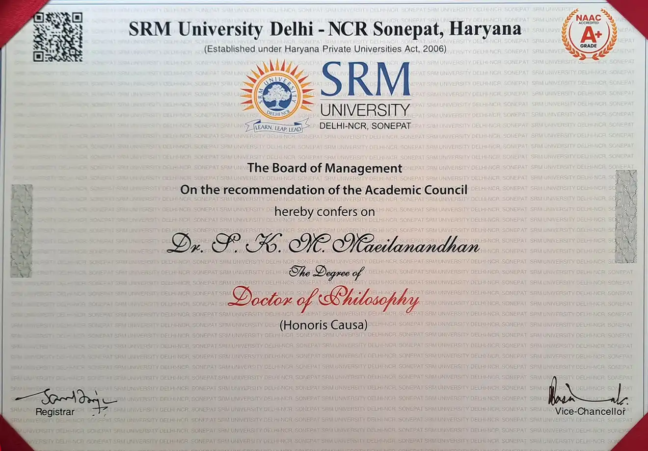 Padmashri SKM. Maeilanandhan, the President of The World Community Services Centre - A well-known social activist, philanthropist, an Indian industrialist and founder of SKM Group of companies, a multi-talented humanistic leader,