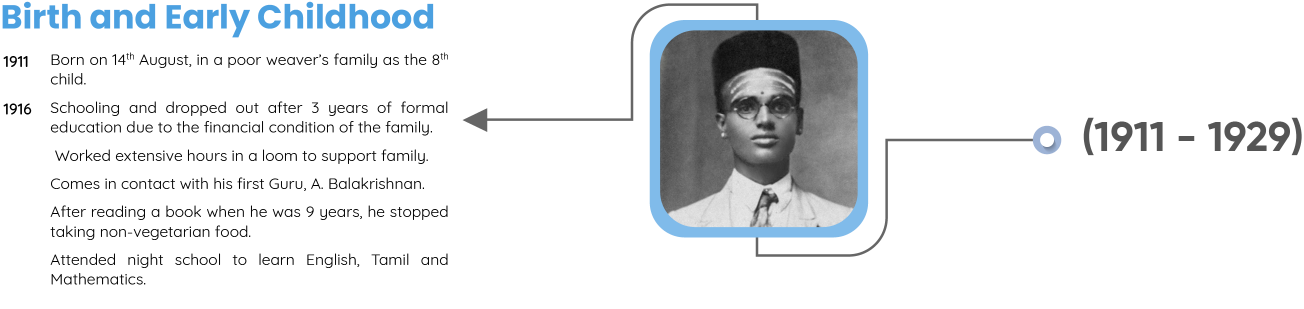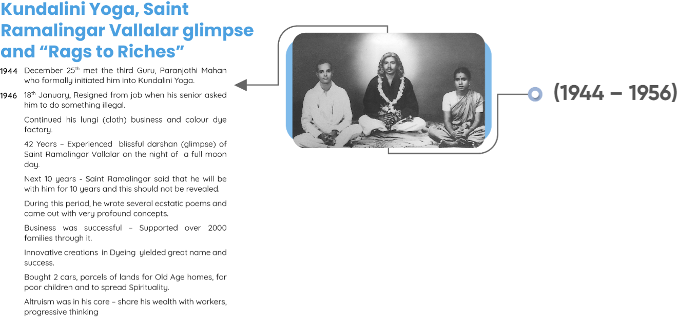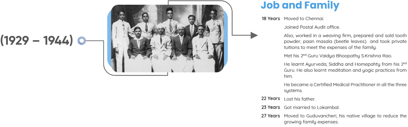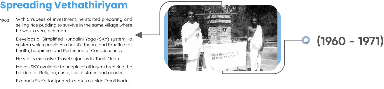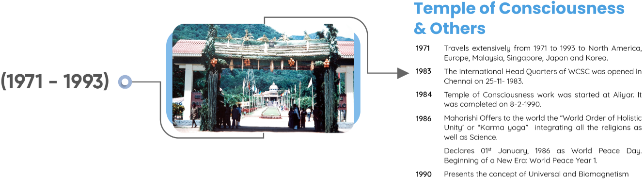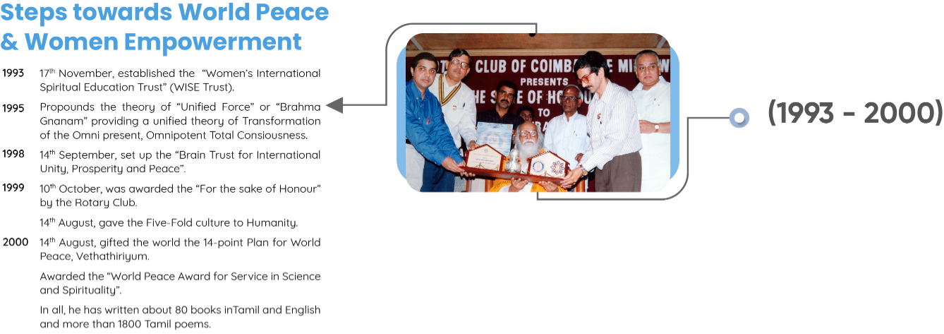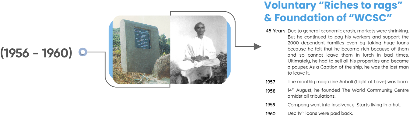 Shri Vethathiri Maharishi - Common Man’s Philosopher, Thathuvagnani and a visionary spiritual leader was moved by the happenings of the Second World War. He, in fact, obtained training from St. John’s Ambulance to serve the people wounded in the war. Though with the atomic bombing, the war came to an end, but it had already caused immense misery and pain on (to) humanity. Having realised the Ultimate Truth and in the state of Spiritual Ecstasy, he saw how the entire humanity was reeling under the pain, misery,(and) hatred and destroying itself. It is this universal horror which made him do something to remove the tears from the face of humanity. This resulted in establishing the World Community Service Centre (“WCSC”) in 1958.
